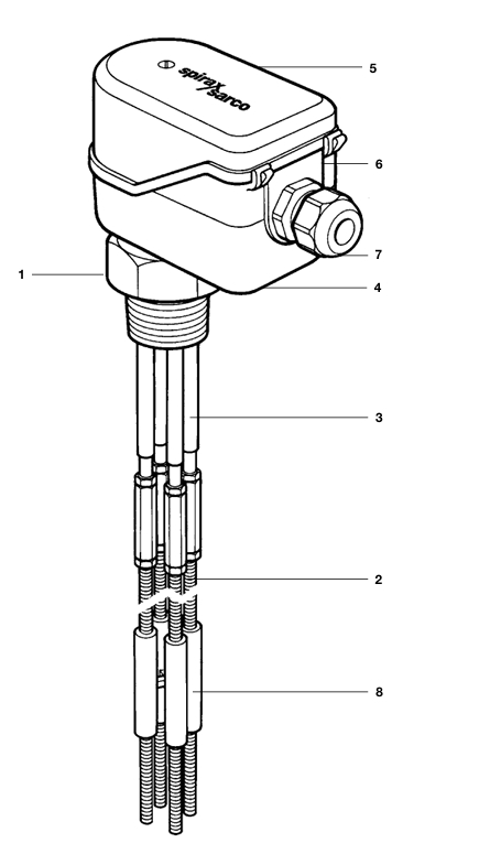 4探头型的感应器尤其适用于安装了3灯“电子显示”液位/ 报警显示器的情况。感应器本体通过螺纹连接处接地,而 锅炉或水箱通常就形成了接地回路。该感应器也可用于混 凝土或塑料水箱,此时使用其中的一个探头作为接地端, 或提供一个单独的接地棒或板。