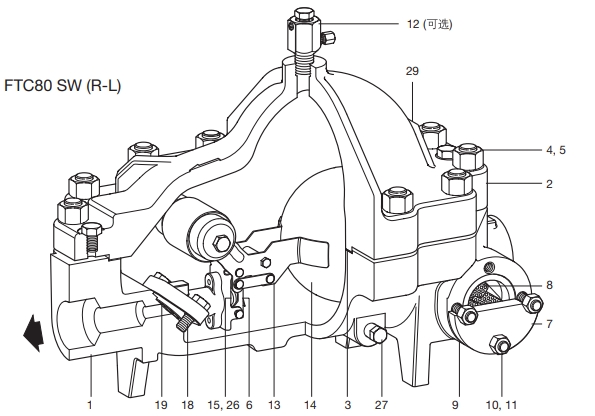 FTC80浮球疏水阀水平连接,标准流向是从右至左(R-L),阀盖顶部留有¾"承插焊接口和堵头,可提供排空气阀选项。FTC80适用于大多数的高压制程和疏水应用。浮球结构结实,耐水锤冲击。内件在线维护方便,底部的排污口可以完全排空阀体内的积水。内置过滤器维护方便,滤网面积大,使用寿命长。